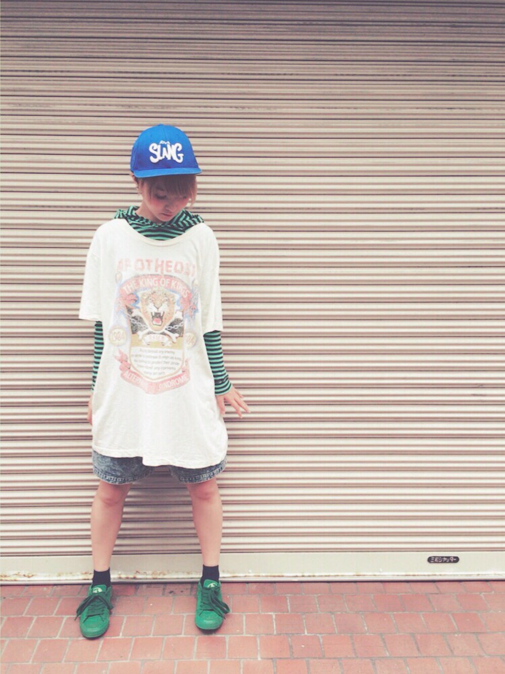 涼しかったのでTシャツにフード付きボーダーインナーを合わせて夏物着回し👍 靴、ショーパン、帽子もすべて寒色系で合わせることで赤混じりのTシャツのデザインがよりインパクトあるように見えるかなーと! オールRNAでテンション上がりますぅ🎵