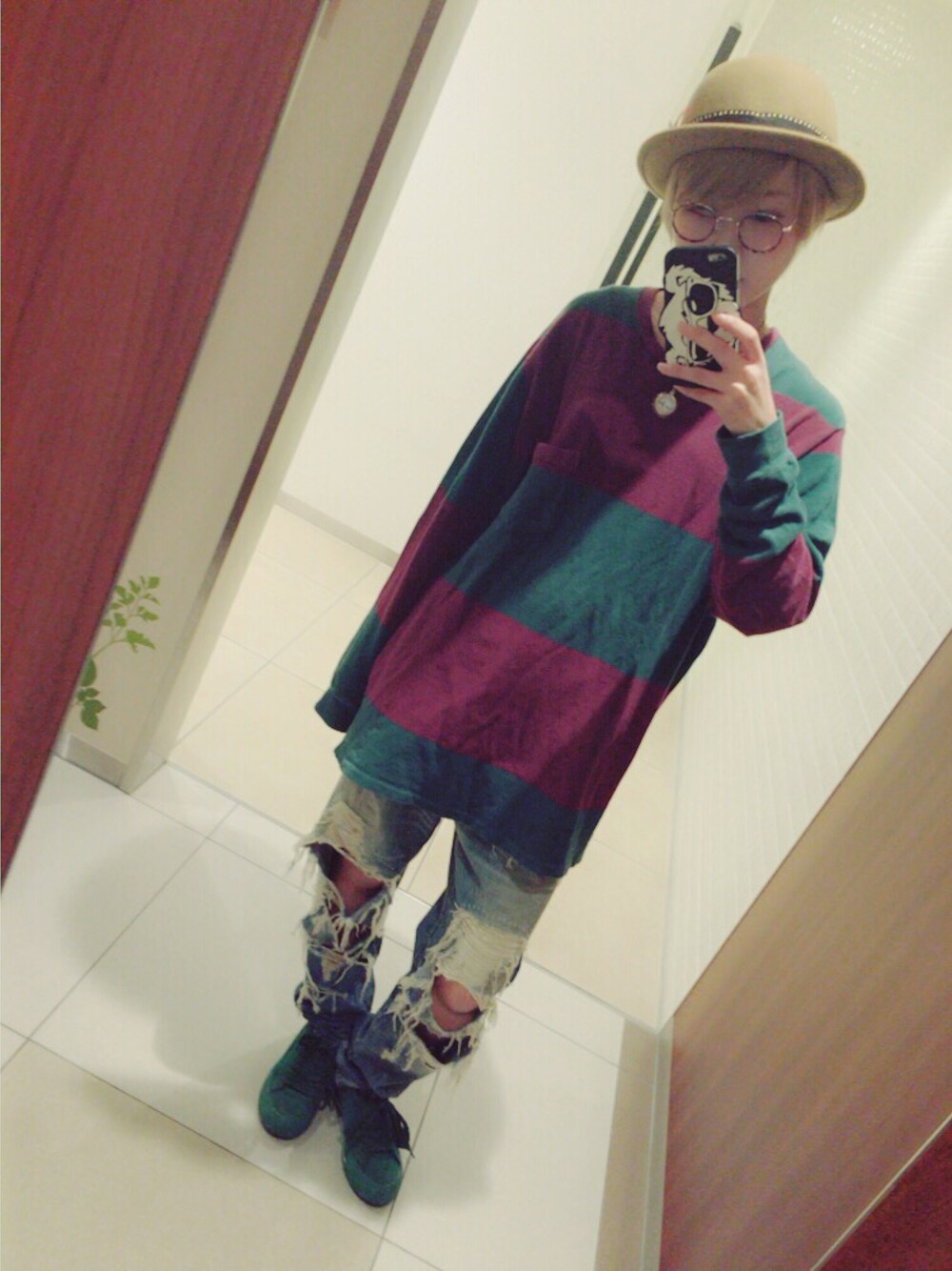 ようやく秋服着れる気温に😭♡ 古着で見つけた緑とボルドーのボーダートップスはゆるっと着てダメージデニムを合わせてカジュアルに! でもハットとメガネで少し落ち着いた感を出しましたふふふ