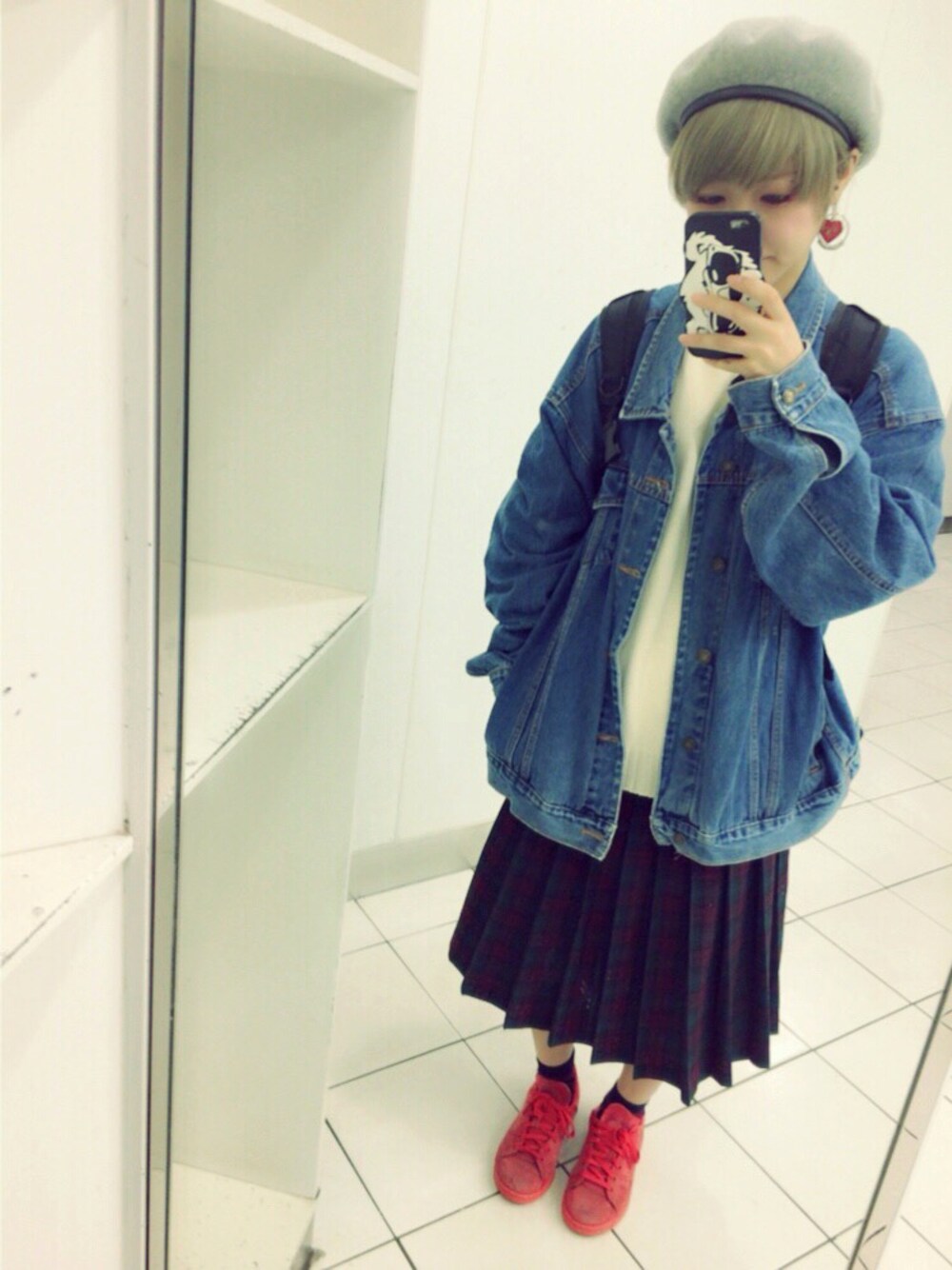 寒くなってきたら大活躍ニット♡古着の組み合わせがとても楽しくなてきました!オーバーサイズのジージャンはだいぶカジュアルなアイテムだけどチェックスカートとベレー帽でそれをおさえめに!