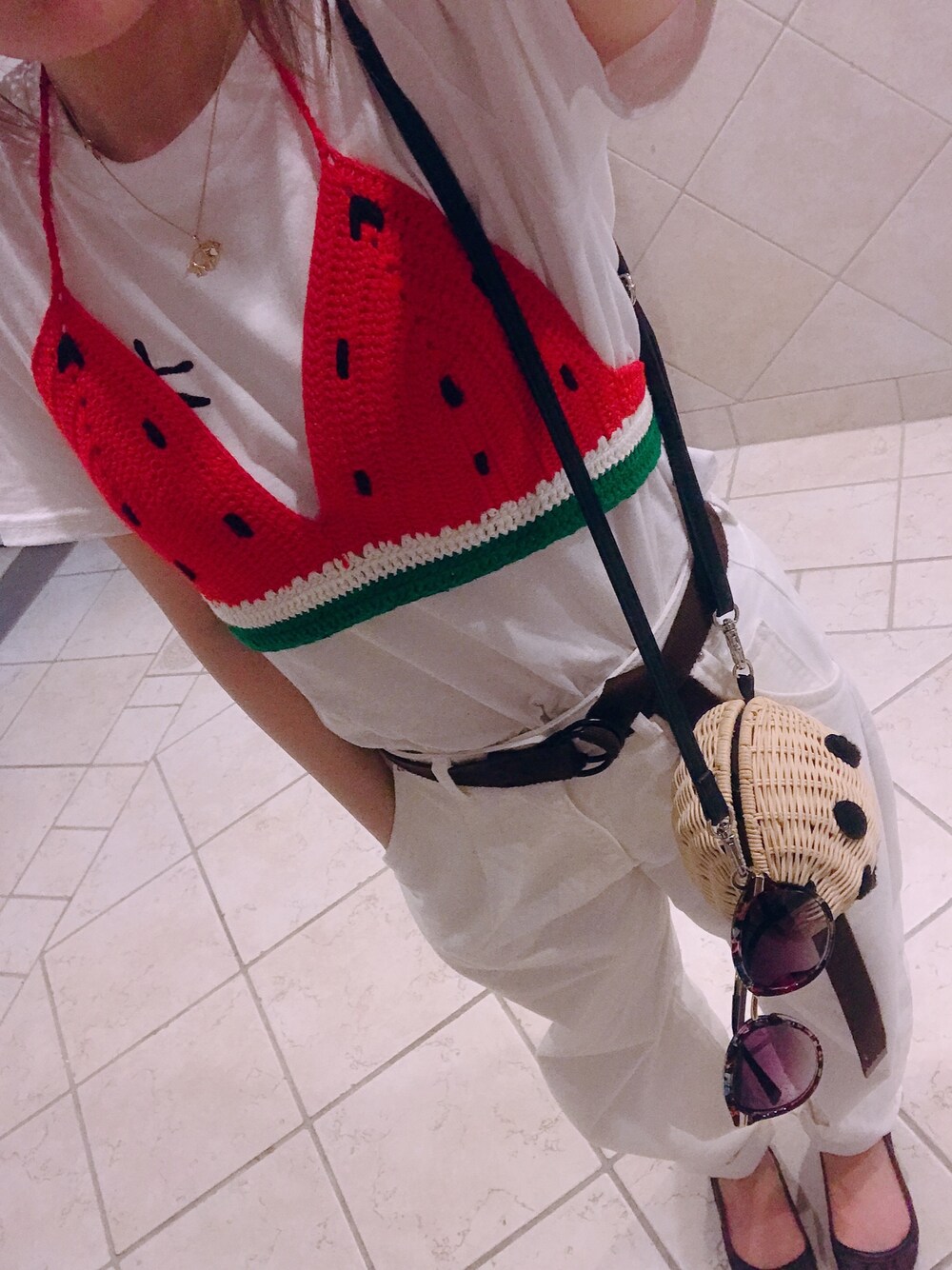 沖縄コーデ🌺 ちょっと浮かれ気味に スイカのビスチェとかしちゃって🍉 編んだの? って知らない人に何回か聞かれるぐらい 印象的みたいでよかった🍉 使い勝手の悪いニコちゃんポーチに 旅先でしか付ける勇気のないサングラス😎 この度で大活躍🌟