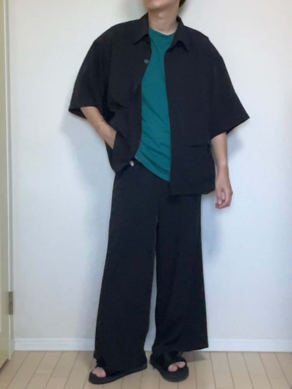 シンプルな色のセットアップに差し色でグリーンを入れたコーデを組みました。
