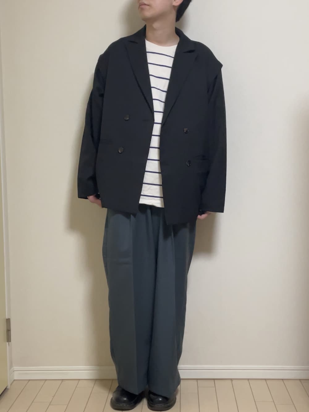 さすがにもう寒くて着れないかな。 テーラードジャケットとバギースラックスのキレイめな服にボーダーTでちょっとした個性を合わせてみました。