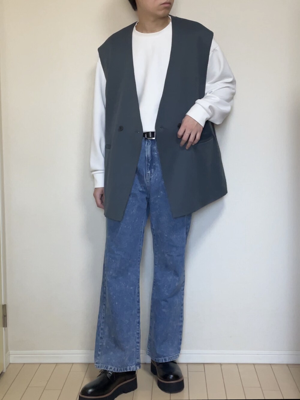 今年流行りのデニムを使ったコーデを組んでみました。 全体的にカジュアルなアイテム多めで、キレイめなジレと革靴で中和させています。