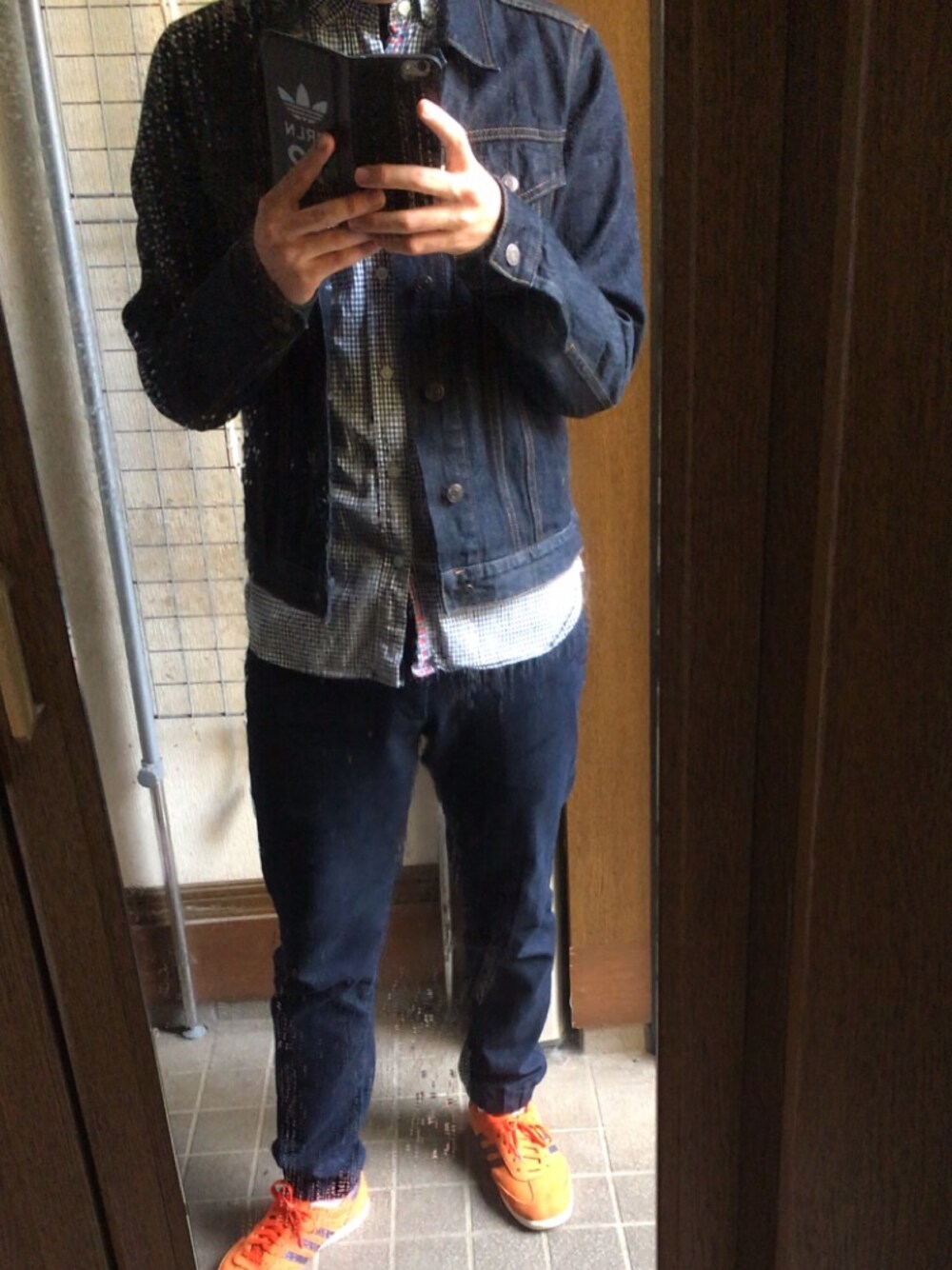 デニムジャケット チェックシャツ?(なんで柄だろ?) デニム柄のジョガーパンツ スニーカー 今日は大学で自殺がテーマのミュージカルを観に行ってきます。 最近デニムが好き。 このデニムジャケットお気に入り(´-`).。oO