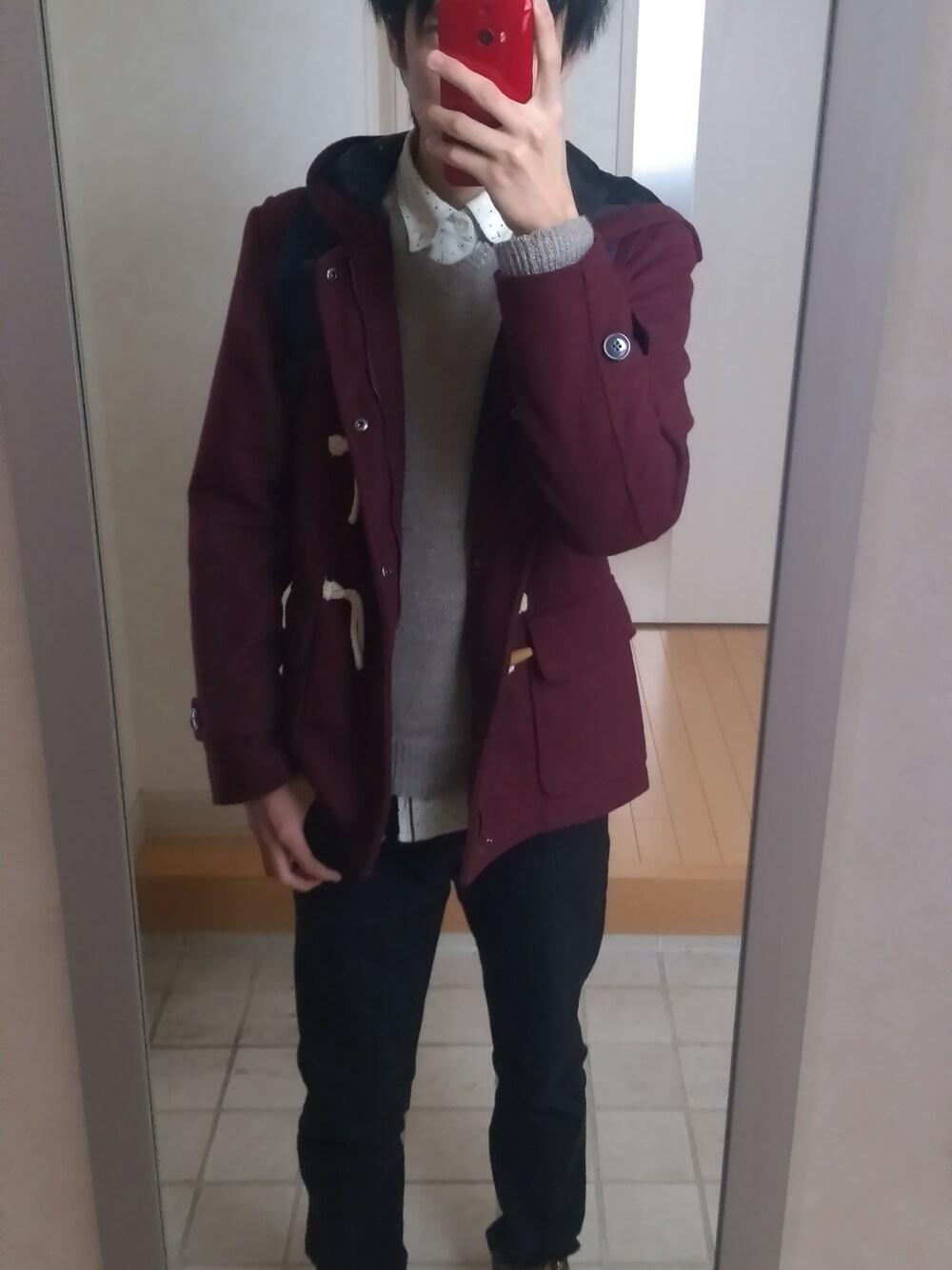 レッド系のダッフルコートを着用したメンズの冬コーディネートの1枚目の写真