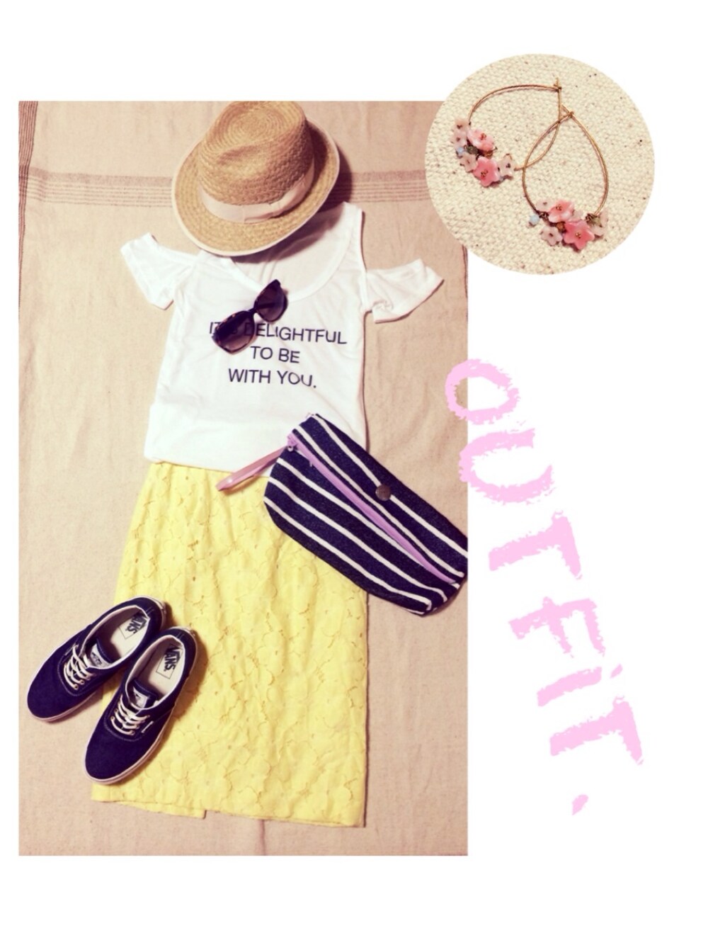 Tシャツ:MERCURYDUO スカート:MERCURYDUO クラッチ:planet blue ペンシルスカート×スニーカーで今年っぽく♡ イエローカラーでテンションあっぷ(´ψψ`●)