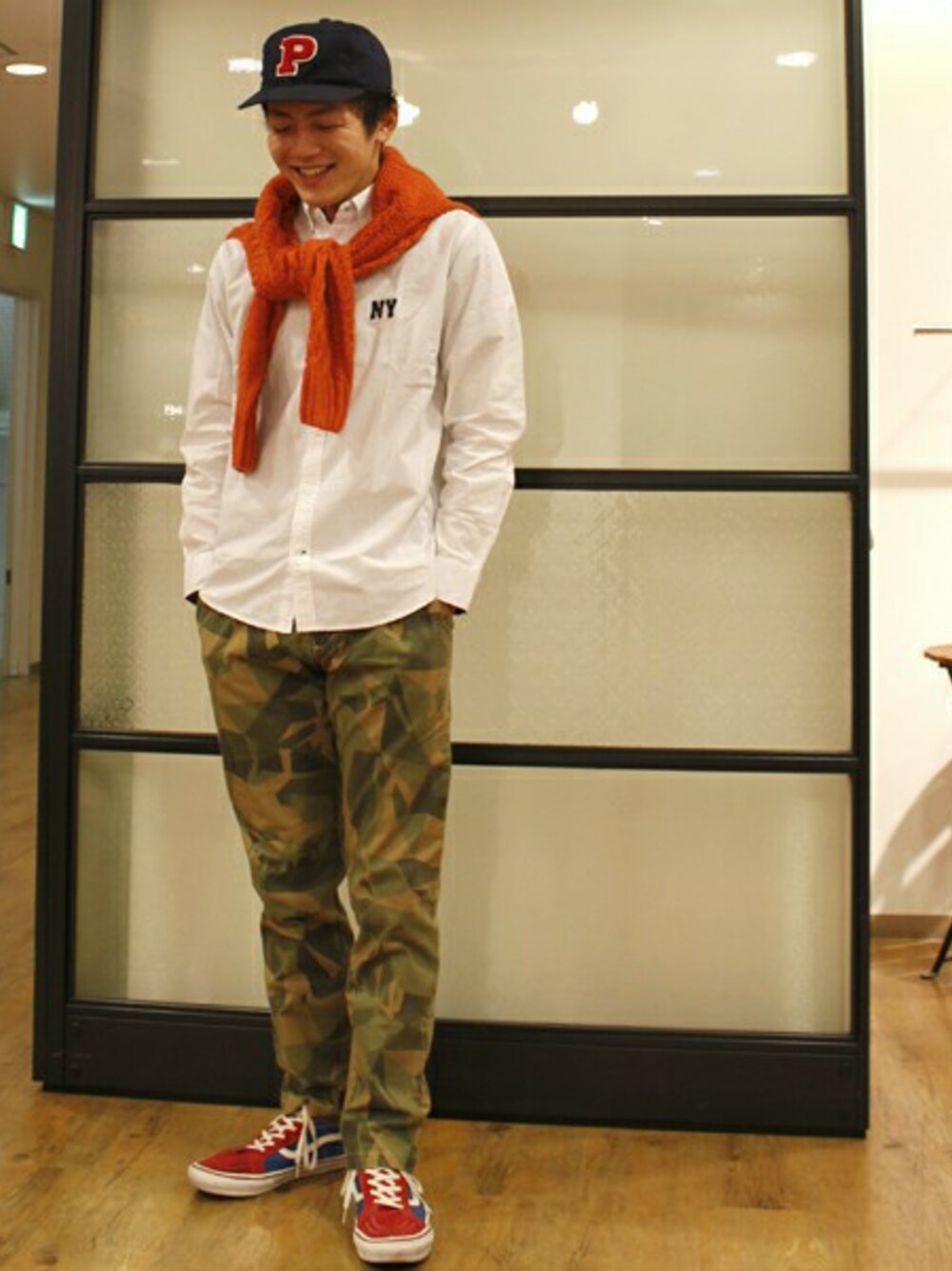 シャツonクルーネックニットのキレイめコーデがオススメ。 ニットが暑いときは肩掛けするとオシャレに! さりげないアニマル柄のカモフラパンツがワンポイントです!