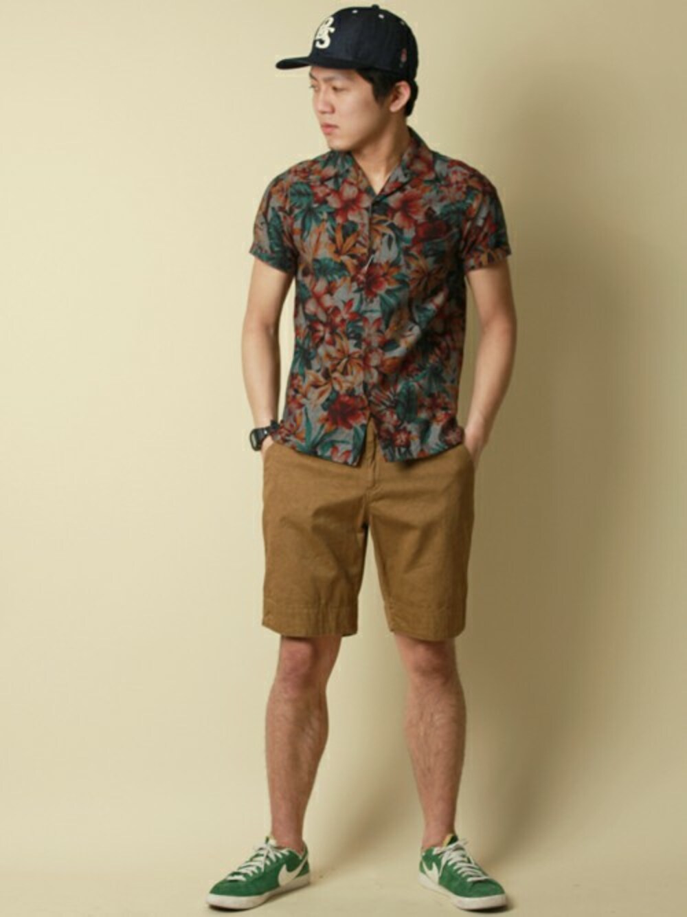 シャンブレーフラワーパターンのアロハシャツの着用コーディネート。 無地ショーツに合わせるのがオススメです! シューズはスニーカーでカジュアルに。