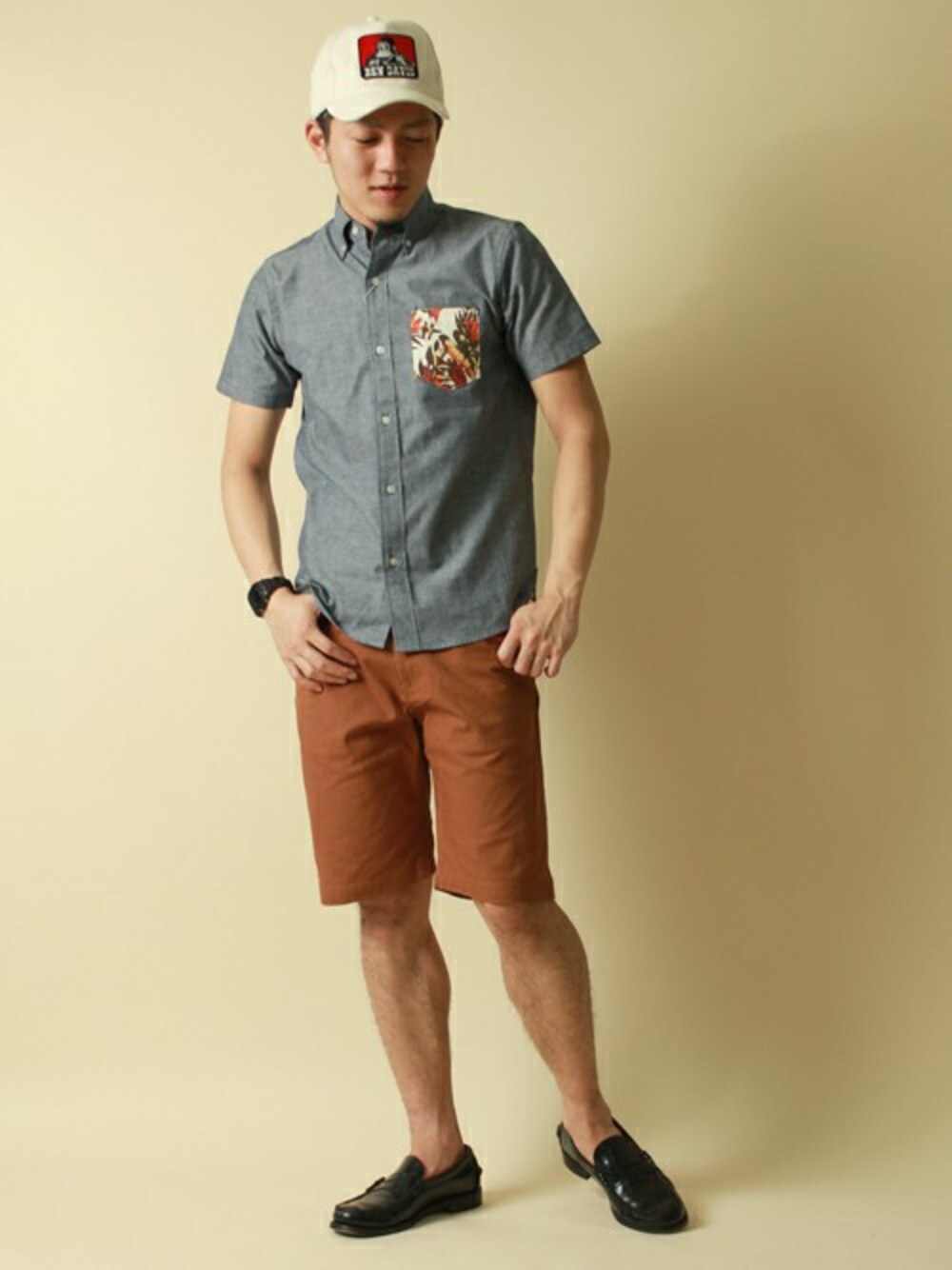 シャツ×キャップの少年風カジュアルスタイル! シャツは前空きでインナーに白TEEを着るのもオススメです。