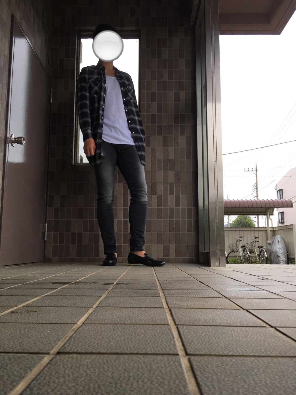 雨でだるいのでシャツガウンとジョグジーンズで楽なコーデ。 足元はナノユニバースのレインシューズ。 安いので気兼ねなく使えます。