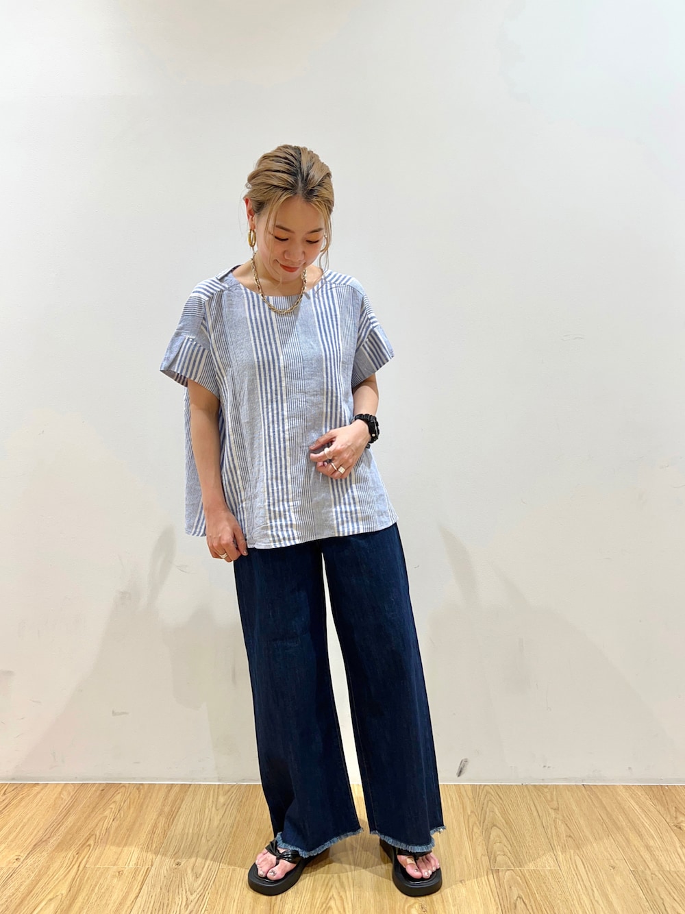 トップスはリネン素材でこれからの夏涼しく着ていただけます😌 柄もストライプが夏らしい! 後ろがリボンになってるので、後ろ姿もおしゃれなトップスです^^ ワイドパンツは形が綺麗なので本当よく履いてます!おすすめです^^
