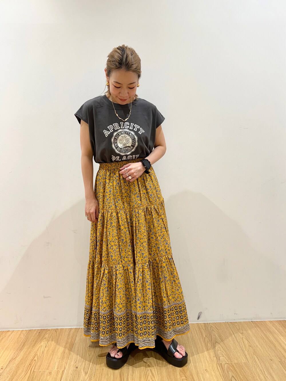 はしごレースで切り替えたティアードデザインの花柄スカート。 歩くたびにふわっと軽やかに広がるシルエットで、優しげな雰囲気を演出してくれます。ウエストゴムなので穿き心地も抜群◎ カラーごとに異なる花模様にも注目。シンプルなトップス合わせにも、主役になる一枚です。 ロゴのトップスはフレンチスリーブでカジュアルすぎずに合わせられます! インにもアウトにも使えるトップスです🙆♀️✨✨