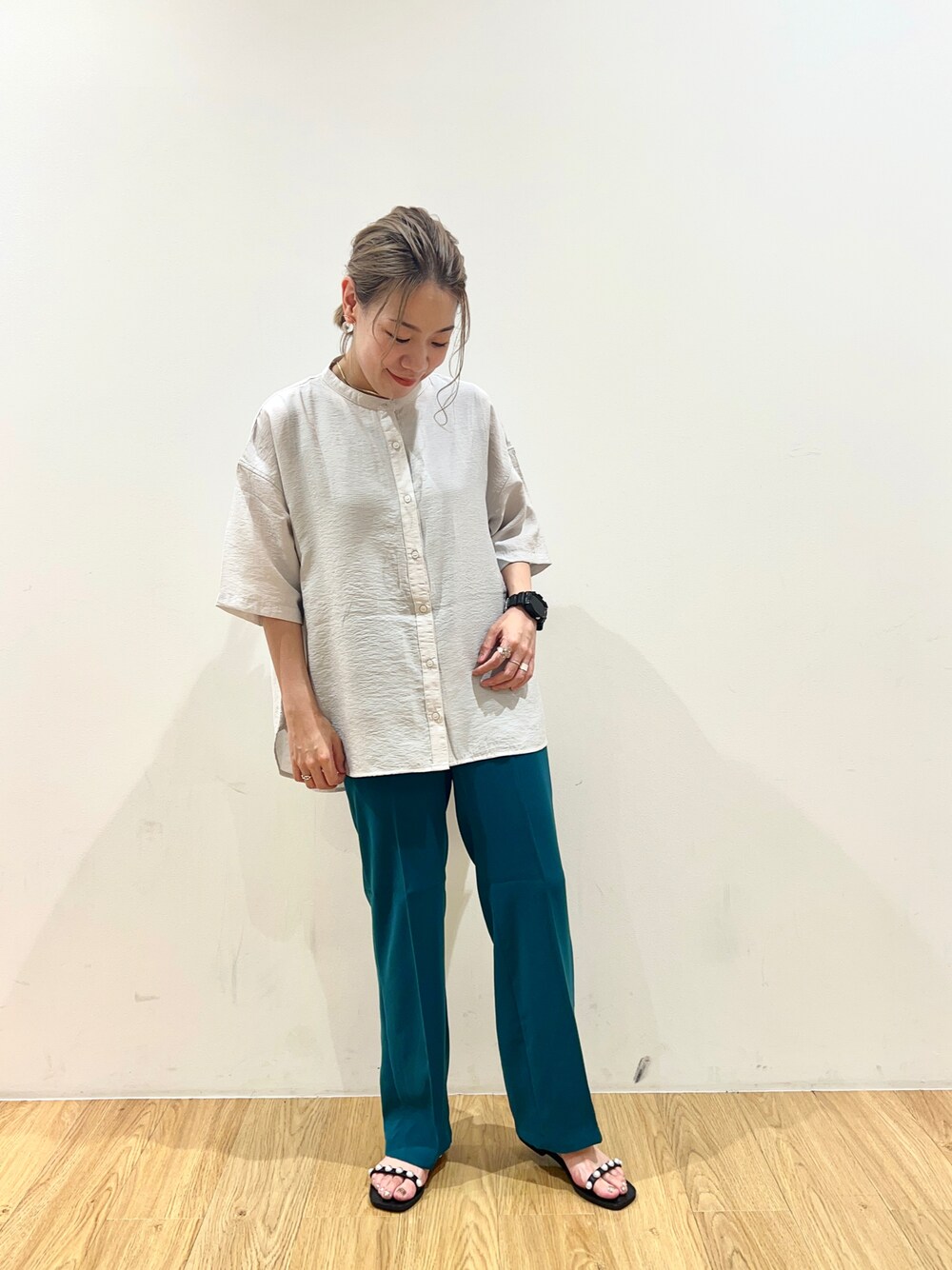 バックフレアのデザインがお洒落なブラウス✨✨前が短くなっているため、パンツでもスカートでも合わせられて、色んな着回しが出来ます😋 半袖なのでまだまだこれからも着れるお洒落なアイテムです😉❤︎ ボトムスは接触冷感なので、さらっとしていて真夏でも涼しく着れます! 素材はポリエステルと書いてありますが、接触冷感の素材も入っているので、ポリエステルのジメジメした感じもなく、さらっと着れるところがオススメのボトムです😋! グリーンが爽やかに着こなせます!