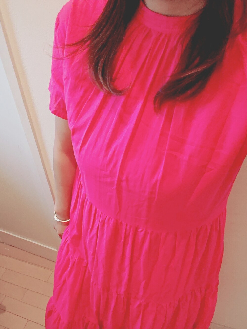 ビビッドピンクでデートコーデ! スカートが広がってかわいいです😊💕 雨の日に一人ド派手です🤣 レインシューズはアサヒシューズで、履き心地最高だし、雨の日が楽しくなりますよ🎵 イヤリングは3Coinsです😊💕