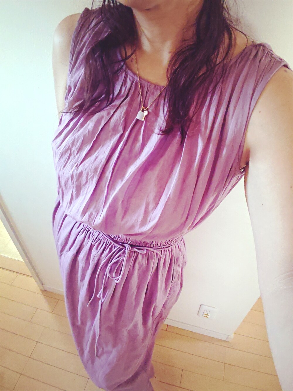 紫のワンピースはアダムエロペのもの。くすんだ感じが かわいい❤️ ウエストにある紐のリボンもゴムでかわいいです😊
