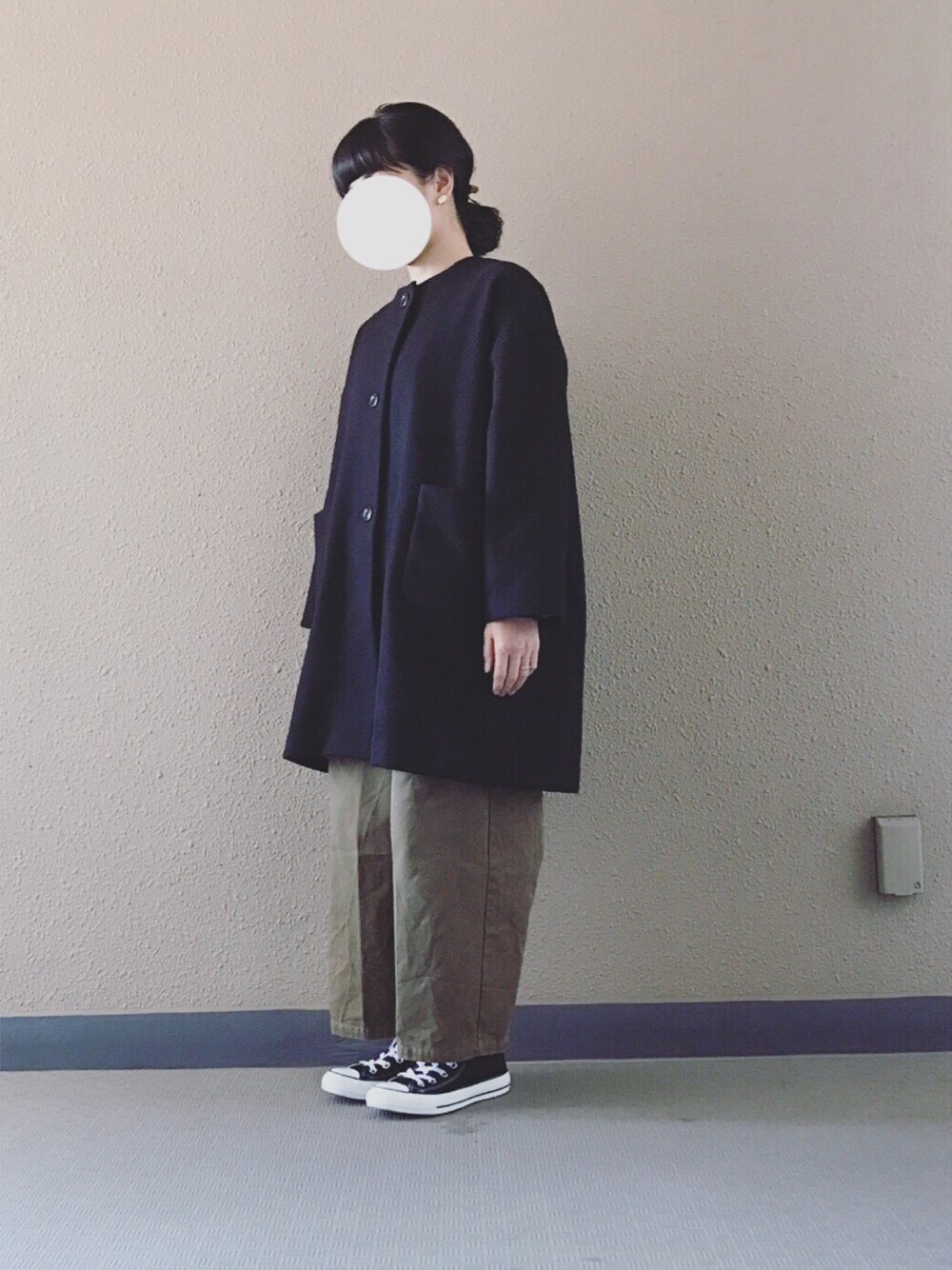 冬のコート作りました。 ドロップショルダー、ノーカラー、ゆったりしたシルエット。後ろにはタックも入れました。 お気に入りの一枚になりました。