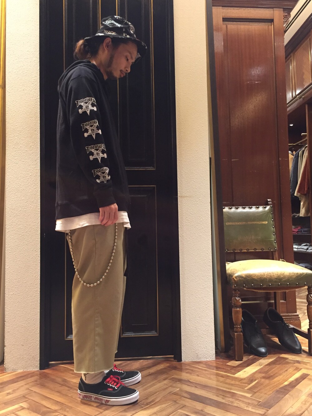 落ち着く。 パーカー : THRASHER × nano・universe カットソー : PRO・TAG パンツ : Dickies ハット : NEW ERA × THRASHER シューズ : VANS