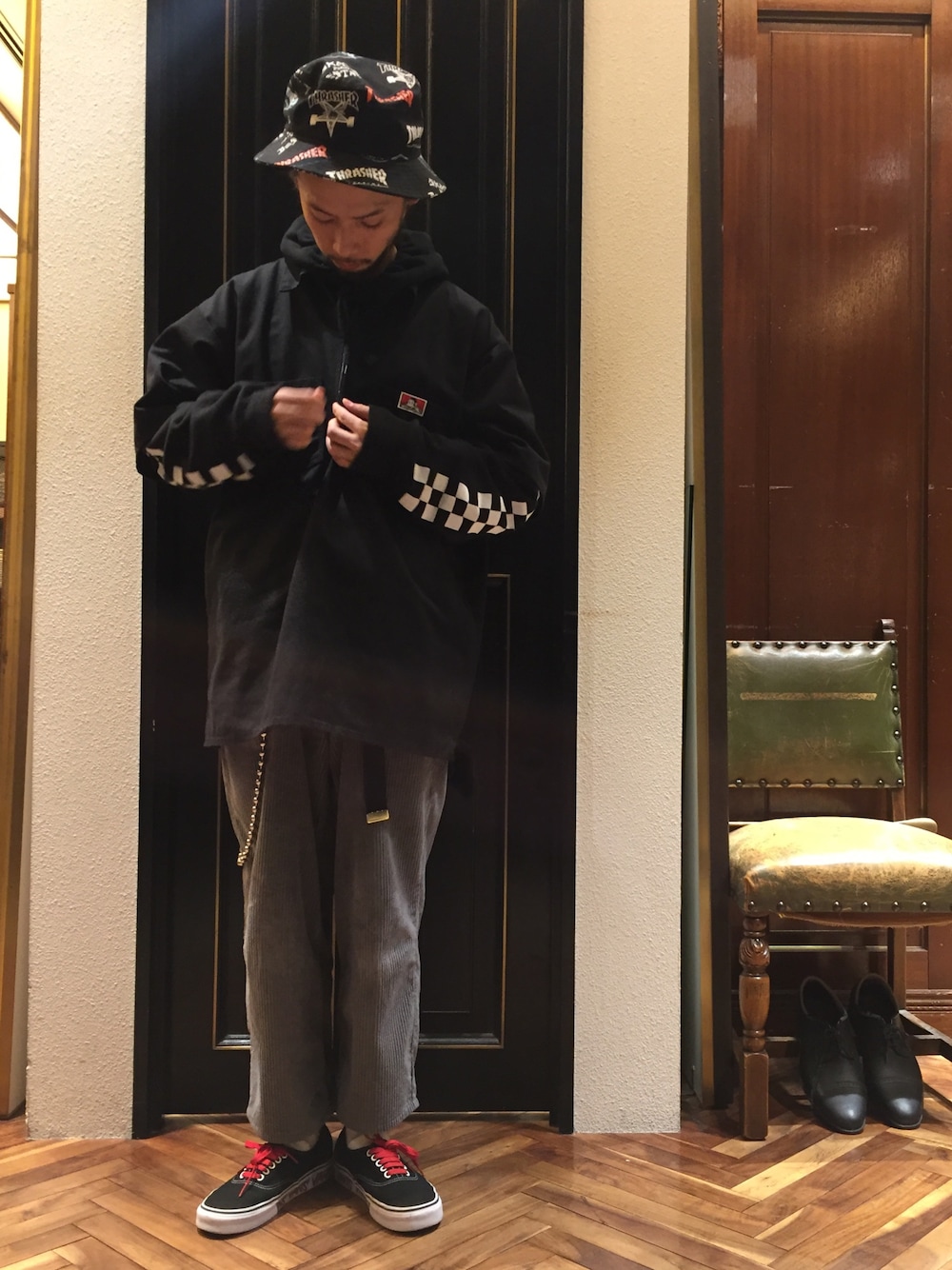 手ブレ。 シャツ : BEN DAVIS パーカー : VANS × nano・universe パンツ : Levi's ハット : THRASHER × NEW ERA シューズ : VANS