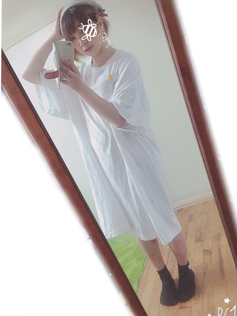 色違いで黒と白の2つ買っちゃった お気に入りのビッグTシャツ( ¨̮ ) めだまやきのブローチは下北沢で買いました これもお気に入り♪