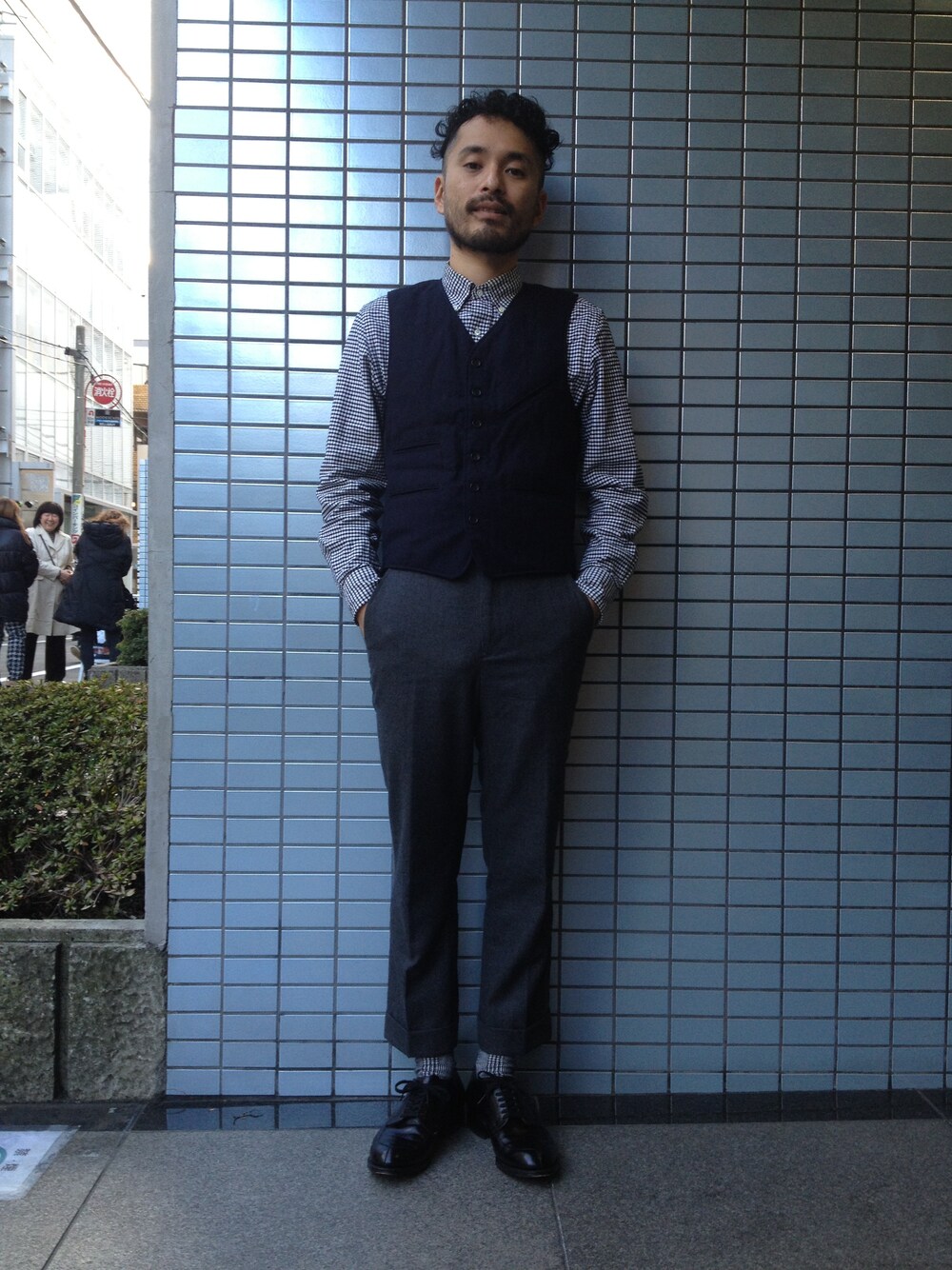 オフィサー風にスタイリング。 重ためな色味の合わせだが、シャツ、ソックスを明るい色目に統一し差し色に。