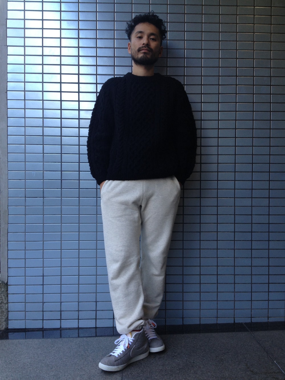 インバーアランのニットをメインにループウィラーのスエットパンツをコーディネートしリラックス感を演出。 足元はナイキ×ビームスのブレザーでスポーツ感を出しメリハリを。