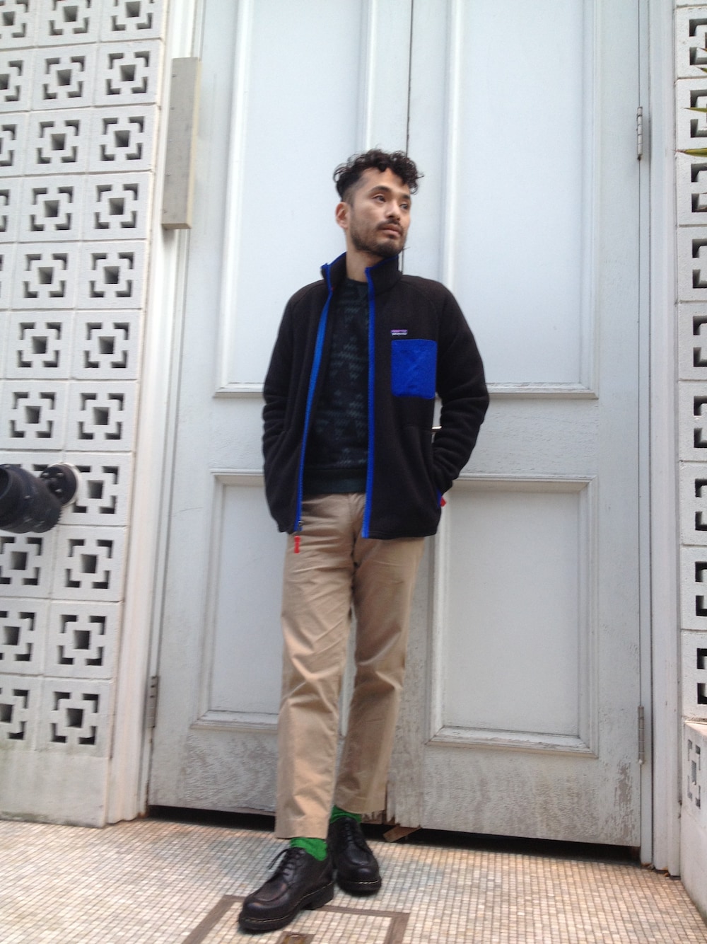 patagoniaのフリースをメインにコーディネート。インナーのAMIのスエットとソックスを色合わせ。