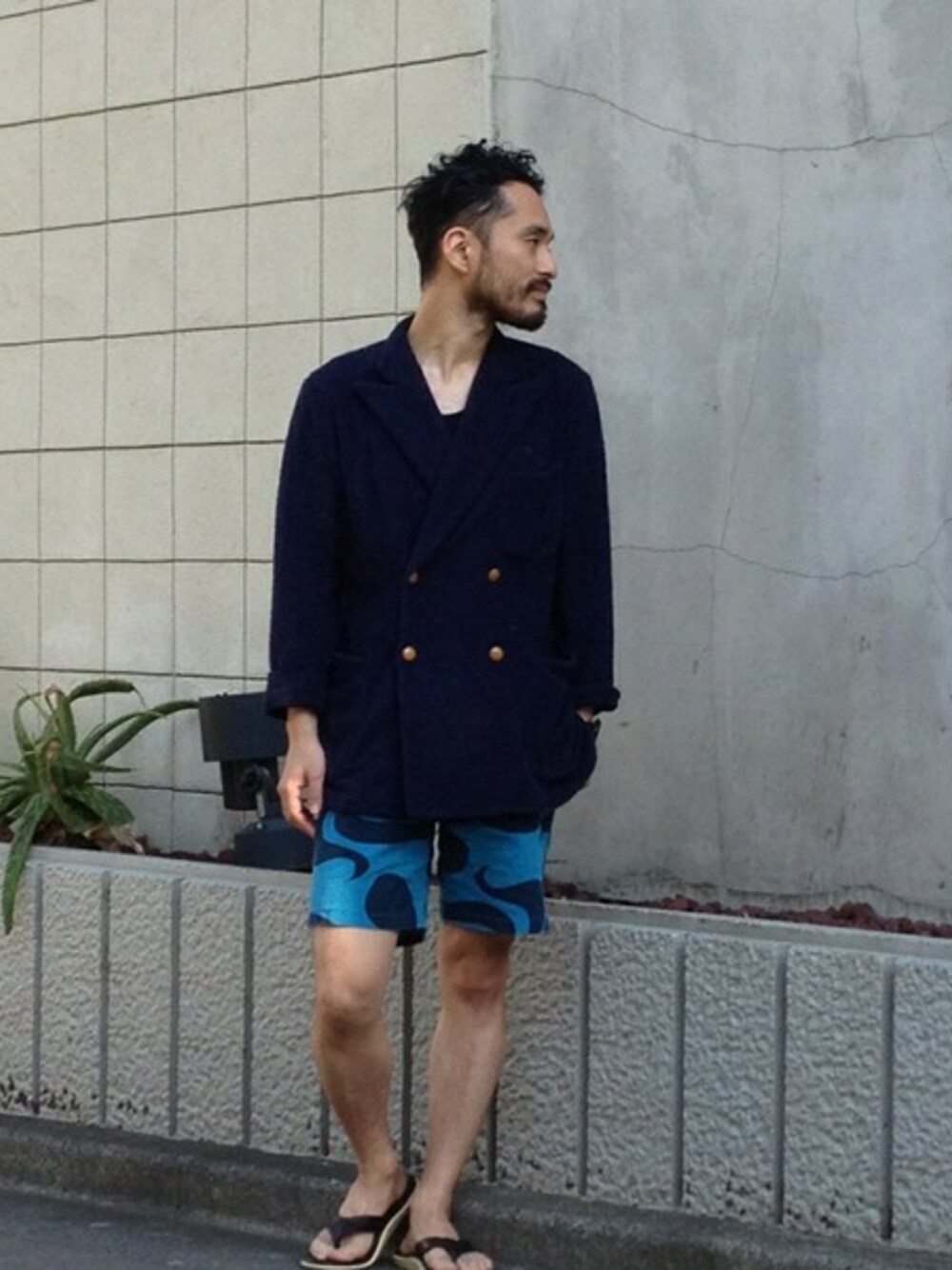 タオル地のジャケットにM.Niiの総柄ショーツをコーディネート。足元はISLAND SLIPPERのサンダルでリゾートスタイル。