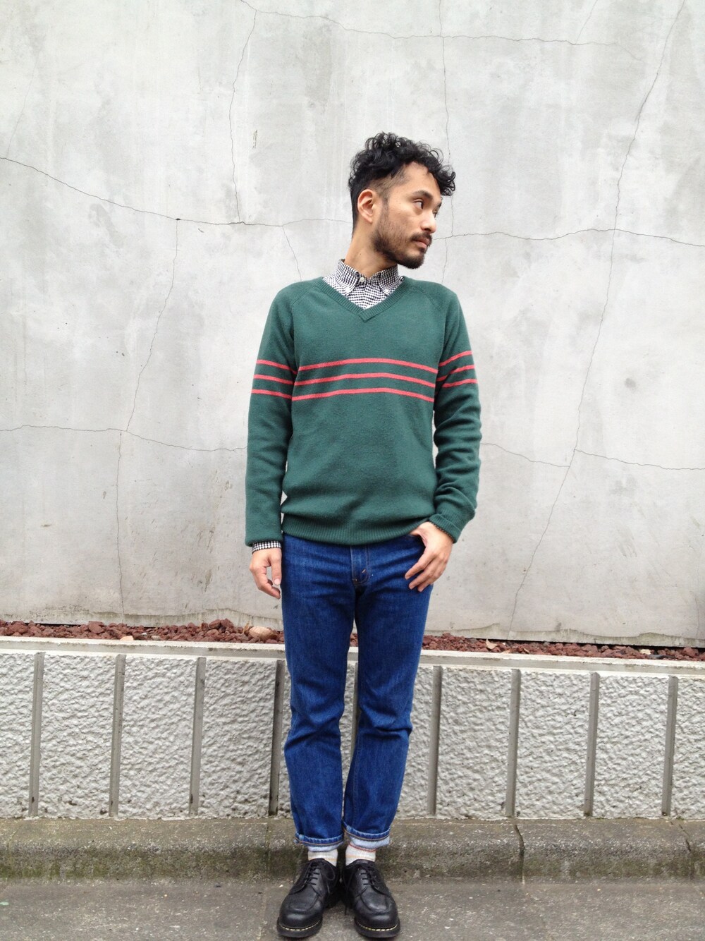 店舗のみ販売のLevi's606 Vintage Clothingをメインにコーディネート。 Band of outsidersのニットは差し色に。