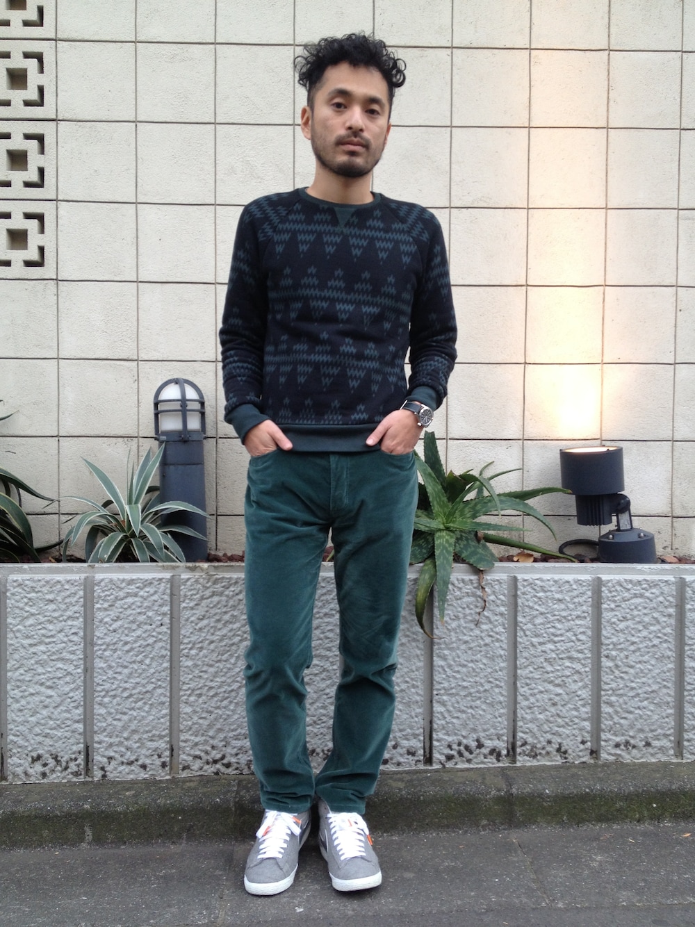 BEAMS SHIBUYA他各店にて取り扱いのAPCのベロアパンツをメインにグリーンのワントーンコーディネート。