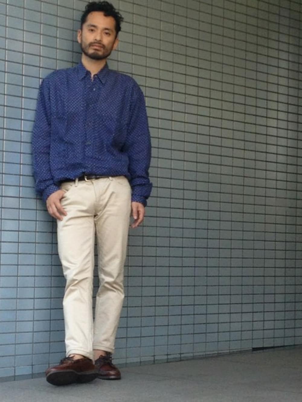 DOT柄のゆったりしたシャツもすっきりしたボトム・シューズでコーディネートする事によりルーズになり過ぎず、メリハリのついたコーディネートに昇華。