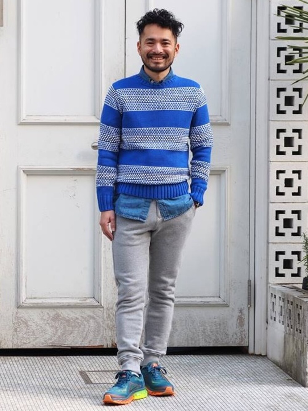 ブルーのアイテムで色合わせしました。 単調にならぬ様、スウェットパンツ+NIKE AIR MAXでスポーツ感を演出。