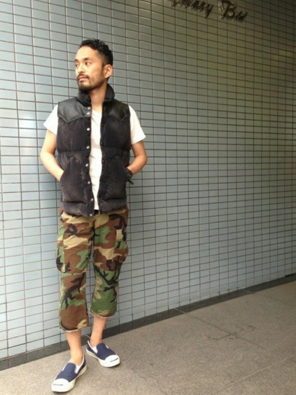 ブラックレザーヨーク×ブラックコーデュロイのダウンベストはカモフラージュ柄のパンツなど無骨なITEMと好相性。 只今BEAMS SHIBUYAではRockyMountain×BEAMSの予約会を7/21(日)まで開催中!!