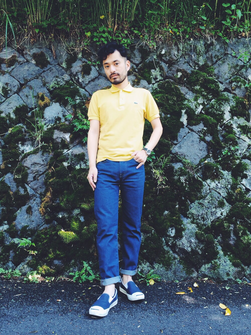 ラコステのポロのイエローを主役にコーディネート。 ラコステ×ビームスの"10years wash POLO"はなんと10年着込んだ風合いを表現!