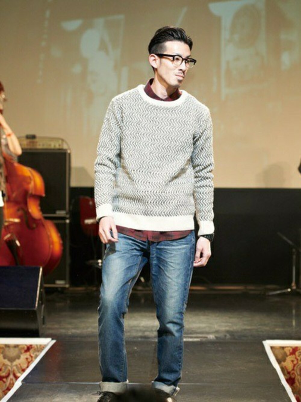 ショーでの一枚。プルオーバーのニットにシャツ、デニムの王道合わせ!