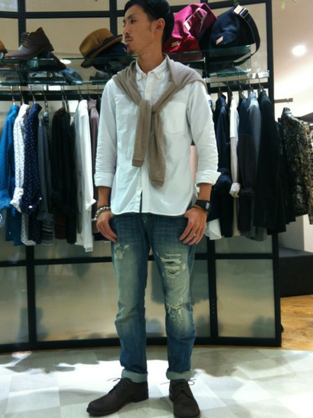 王道白シャツ、デニム合わせ! カーデを添えてフレンチカジュアルスタイル