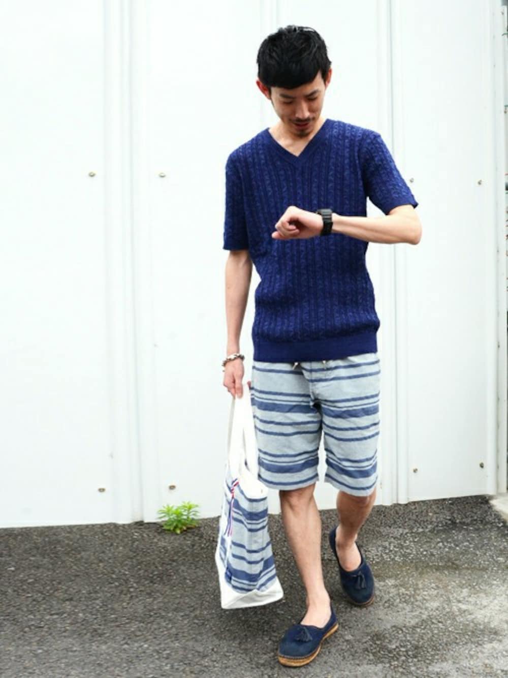 ワントーンマリンStyle。 被りのニットにショーツをカジュアルになりすぎないようにブルーのワントーンでまとめてみました。