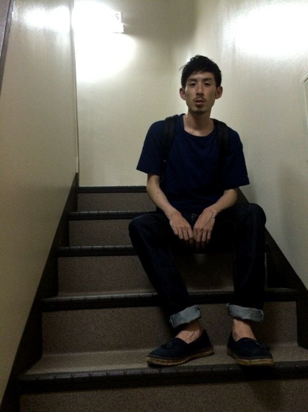 ブルーのワントーンコーデ。 定番のリジットデニムをドロップショルダーのTシャツでラフに。