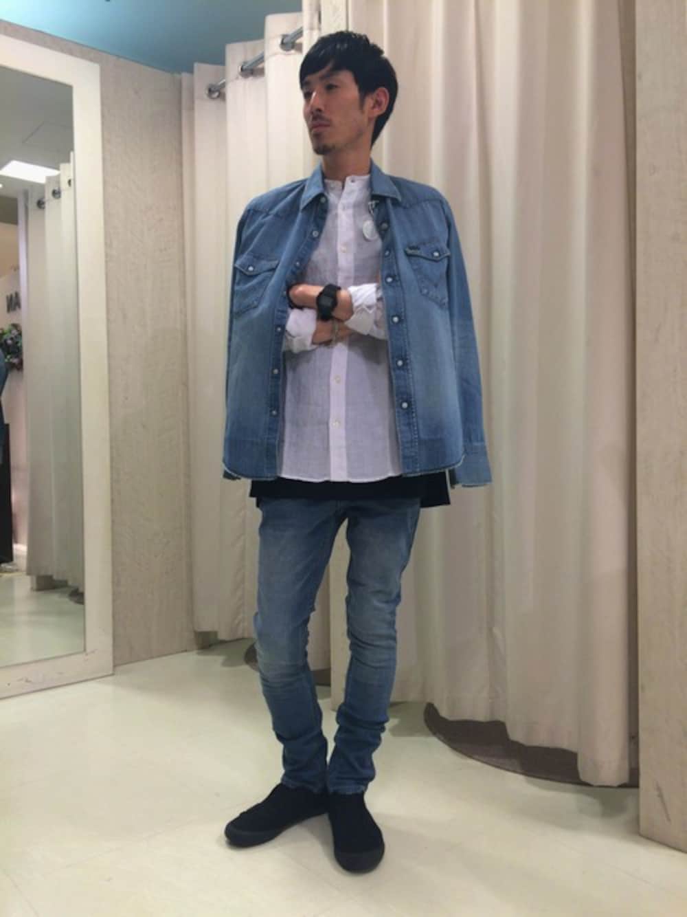 デニムのセットアップstyle。 あえてシャツオンシャツで、清潔感を意識してみました。