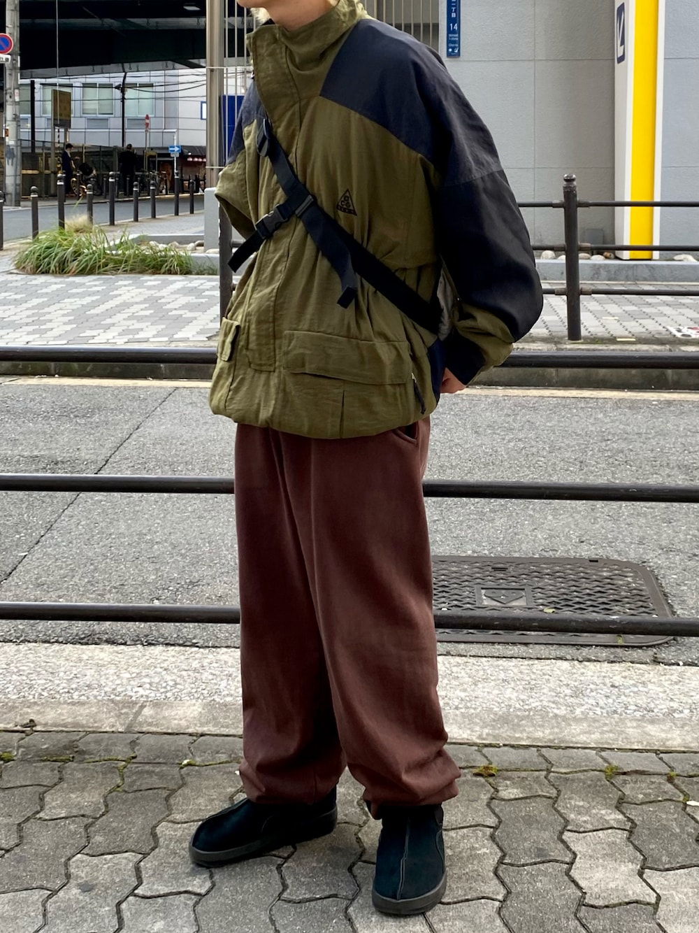 カーキとブラウンのアースカラーを使ったアウトドアスタイル。 アースカラー同士のアイテムを合わせることとナイロン×スウェットの素材感の組み合わせは間違いなしです🙆🏼♂️