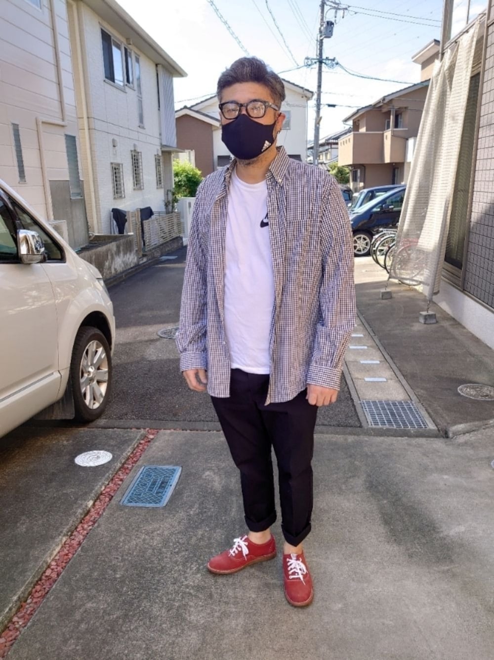 見て頂きありがとうございます。 モノトーンコーデ 赤の靴を差し色に~