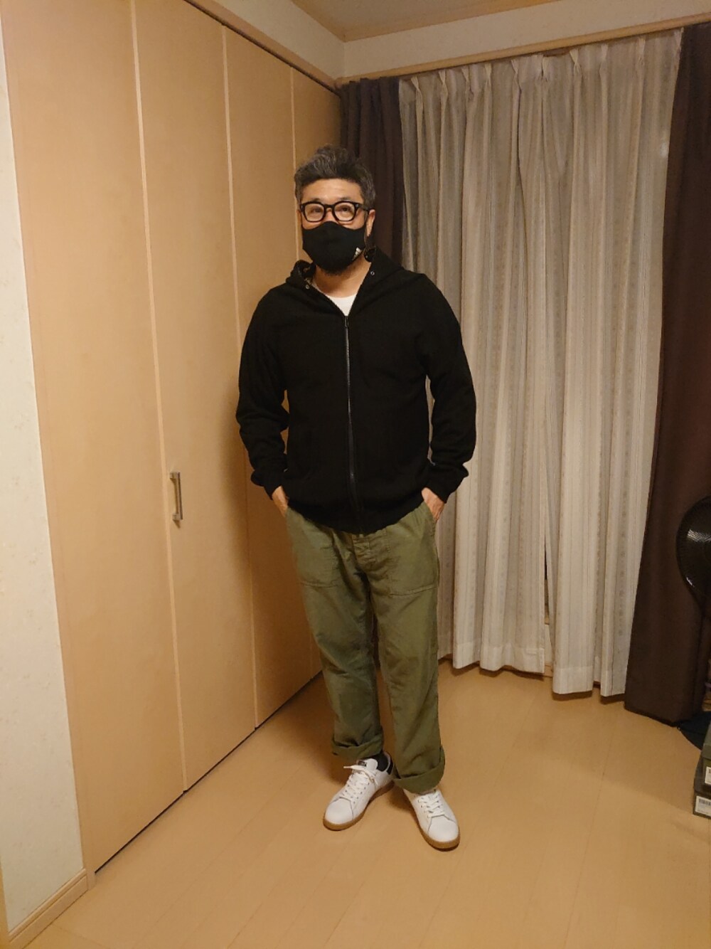 見て頂きありがとうございます。 黒い厚手のジップアップパーカーとワコマリアのベイカーパンツ 靴はスタンスミスと超シンプルコーデです。