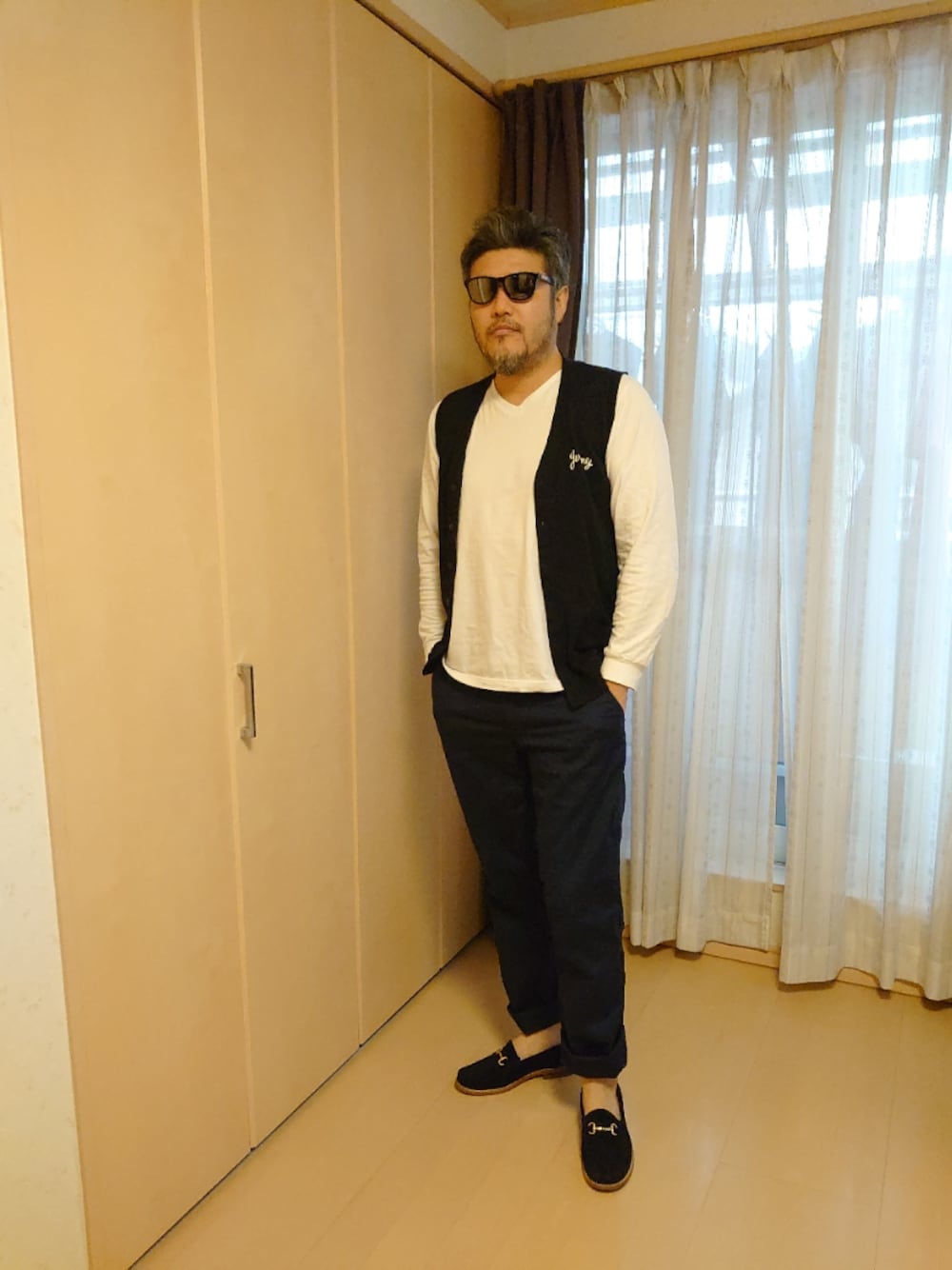 見て頂きありがとうございます。 Vネックの白ロンTとコットンニットベストのコーデ 昼間はまだカーディガンよりニットベストが丁度良いです~
