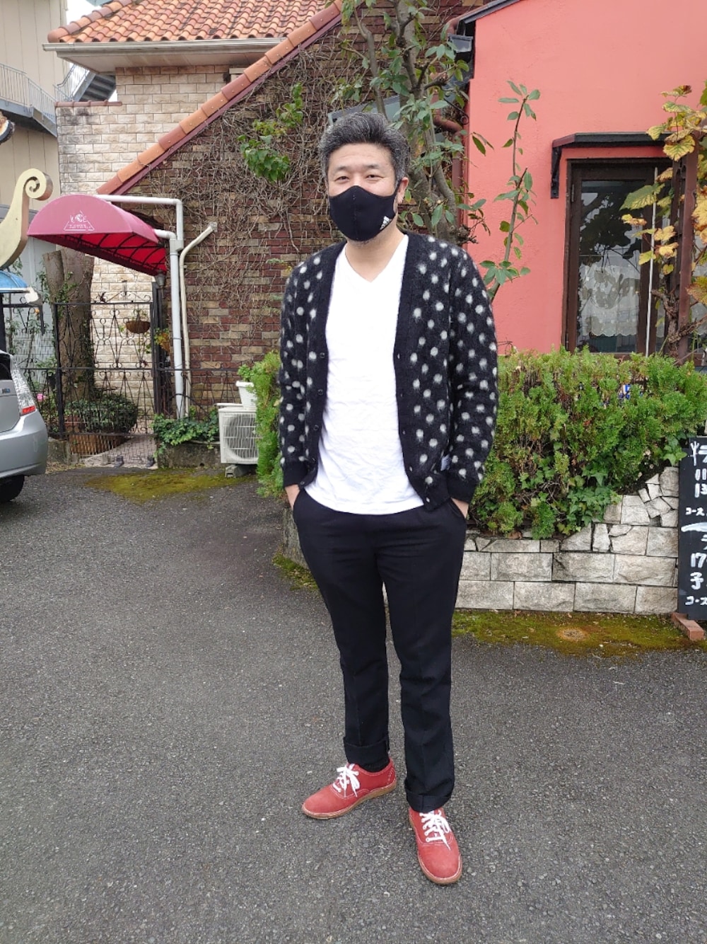 見て頂きありがとうございます。 嫁とランチに行ってきました。 モヘアのドットカーディガンとスラックスのコーデです 靴だけ赤で差し色に~