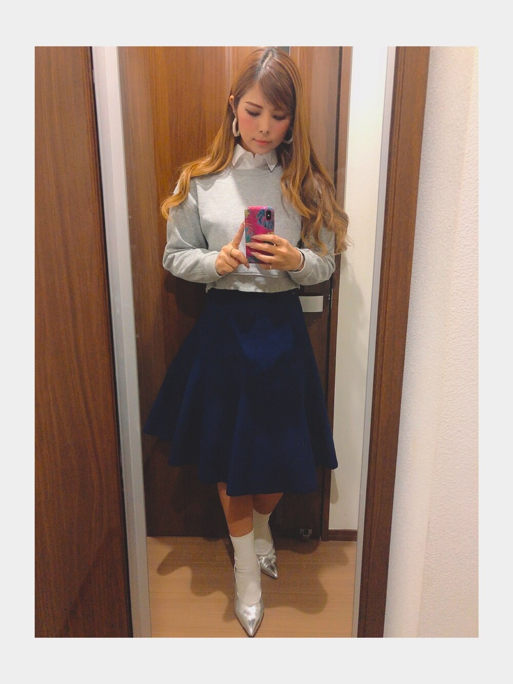 WEARday3😋🤟🏻 #DayOffStyle 歩き回らんからヒールで😚👠 このルシェルのフレアスカートはたぶん10年近く履いてるかな😳✨ Outerはこれにルシェルのネイビーのスタジャン羽織りました😍 こーゆーちょいUKレトロガール風もスキ🥰🇬🇧 #LeCielBleu