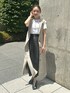 ロングタイプのジレでも、リネンライクジレはかなり涼しいので真夏でも問題なく羽織れる優れものです!ハリ感がありオフィスカジュアルにも着やすい着心地のいいココTEEと合わせたコーデです。