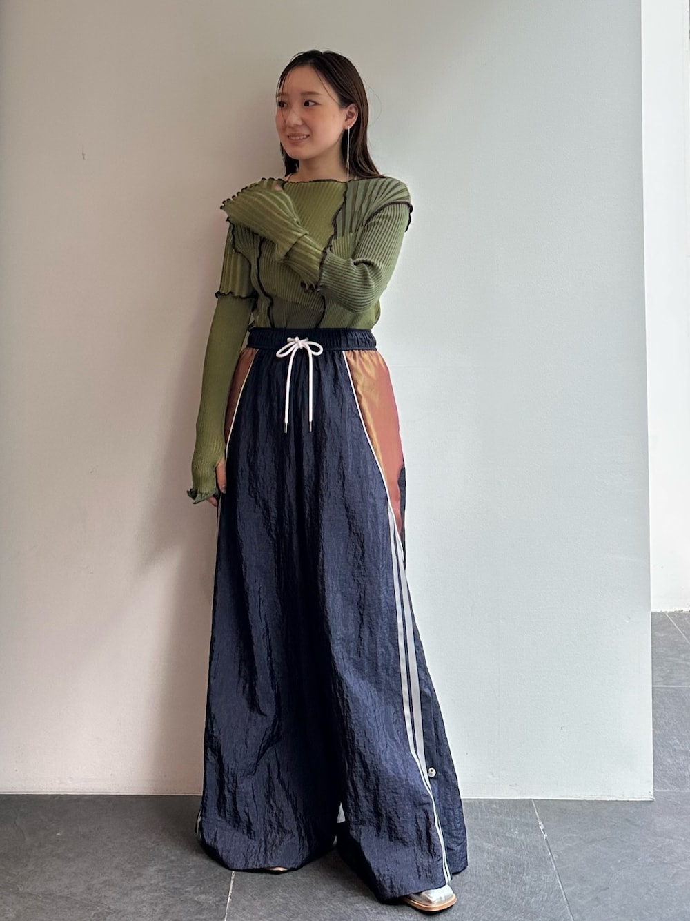 トップスの袖は長めなデザインですが、フィンガーホールがあるので、腕にくしゅっと生地をまとめてきていただくと可愛いです。パンツは160cm前後位の方でスニーカーでも履けると思います!