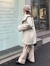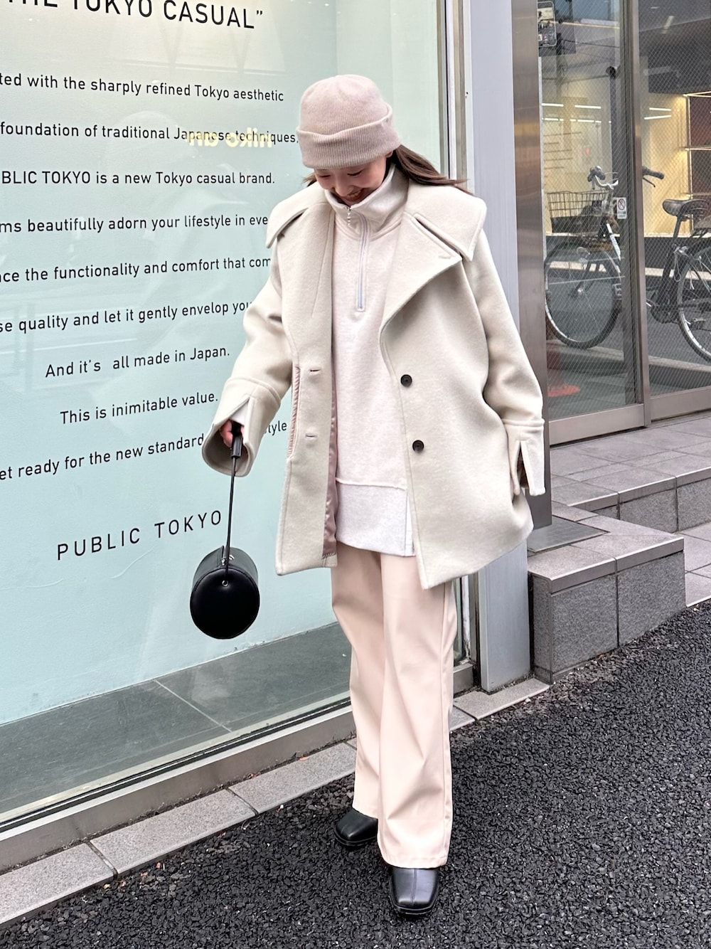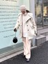 明るめなワントーンコーデです。ニットだとキレイめに仕上がるので、ラフにスウェットで合わせるのも今年っぽくて可愛いです◎