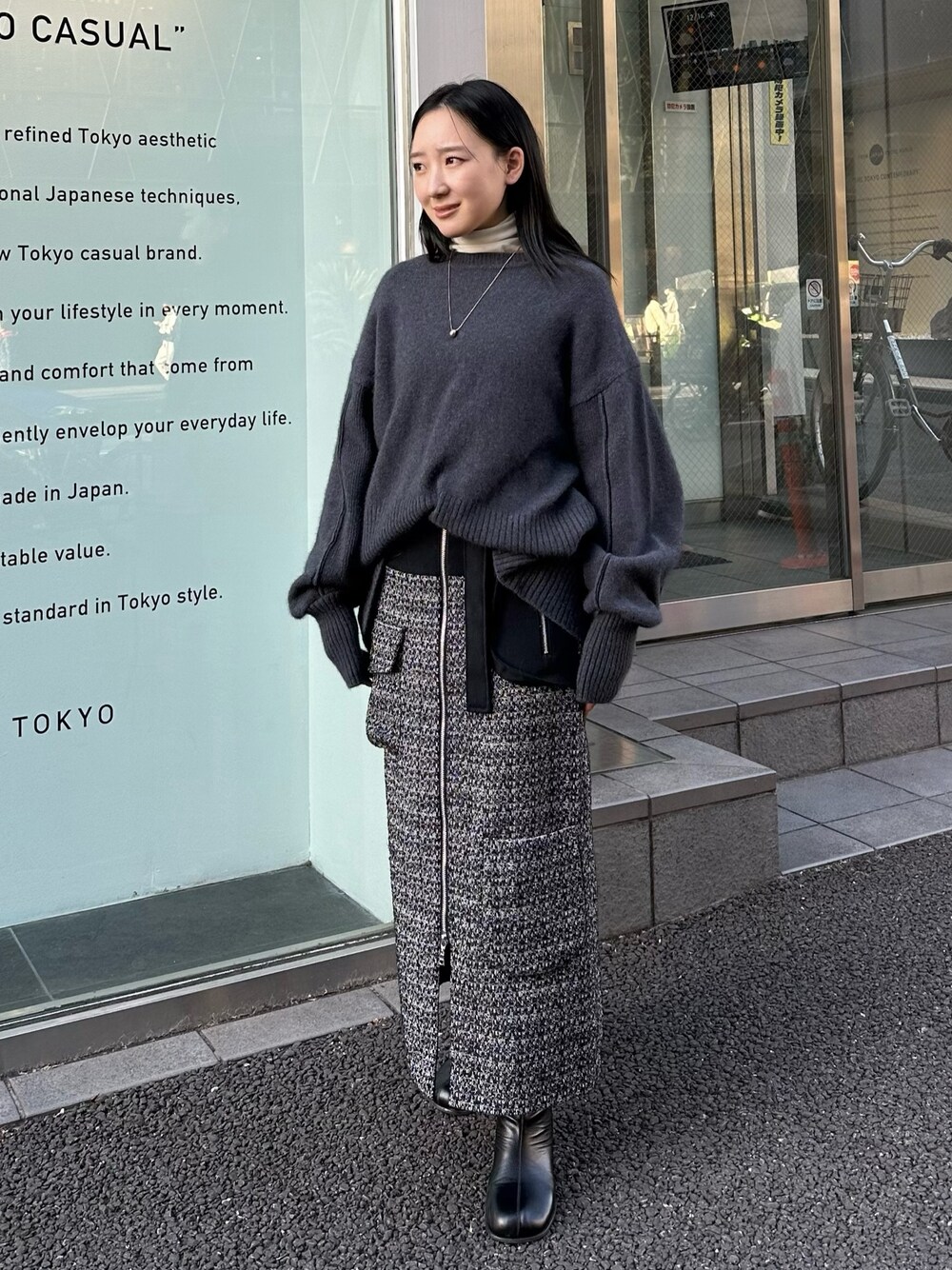 ツイードのスカートですが、甘くなりすぎないようにワークディティールやジップが付いてるのでカジュアルに少しモード見えもするのがポイントです!