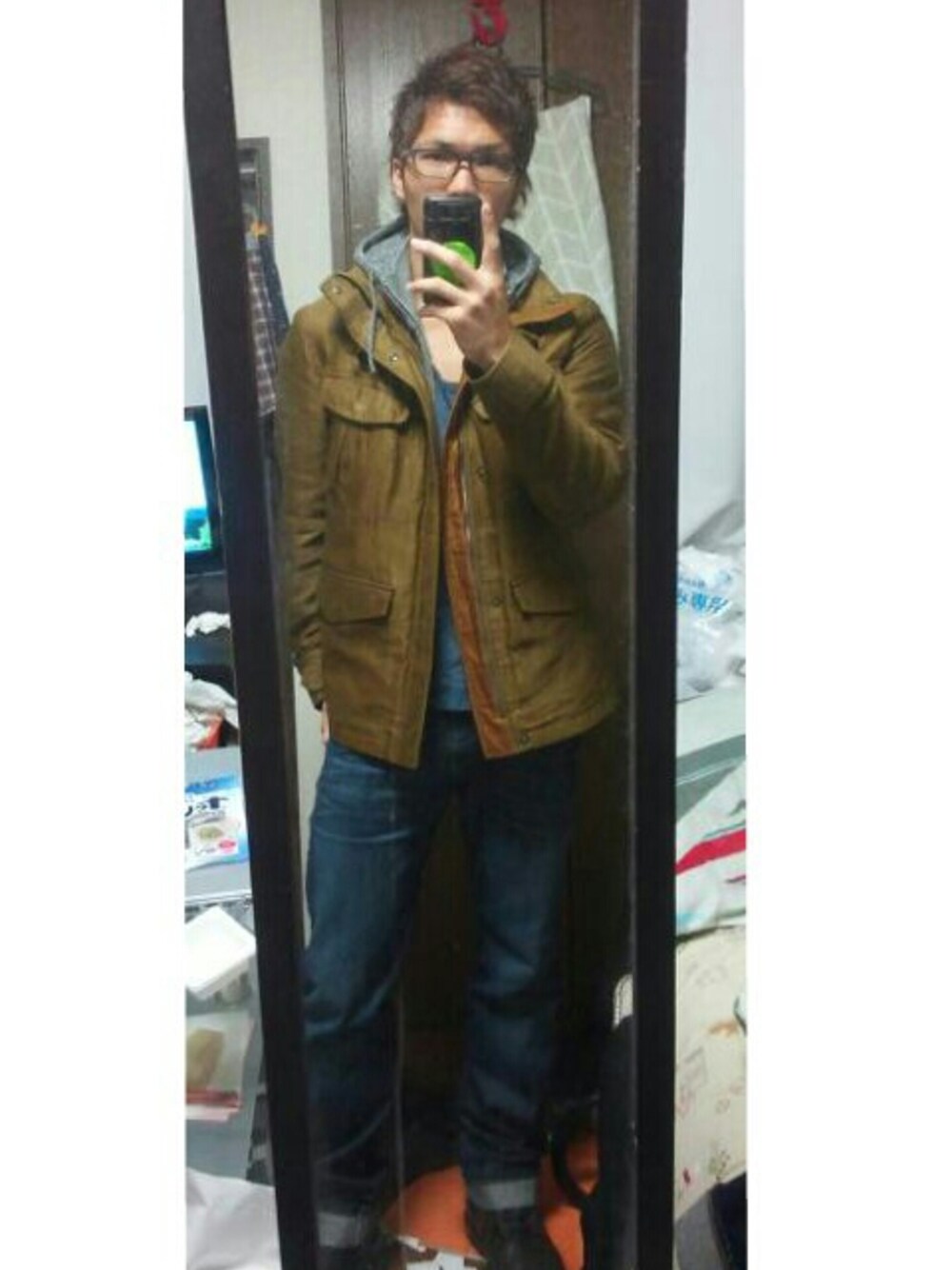 R.NEWBOLD のミリタリージャケットにデニムとブーツを合わせて、パーカーとメガネで抜け感をつくりました!