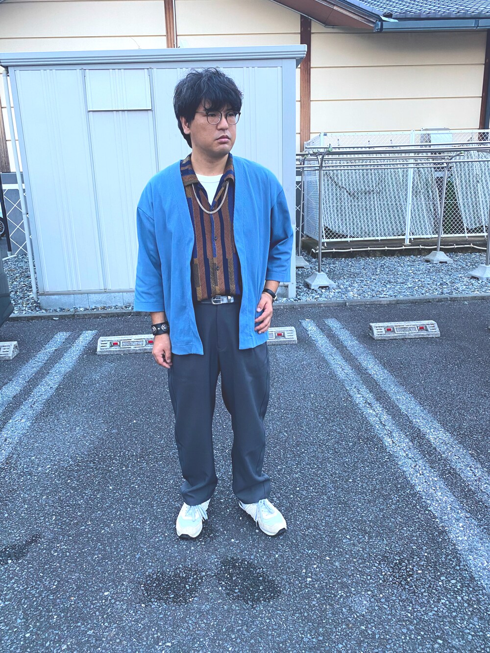某温泉施設の前で撮影しました。温泉いいよね〜。 季節を意識して、七分袖のカーディガンを活用してみました。